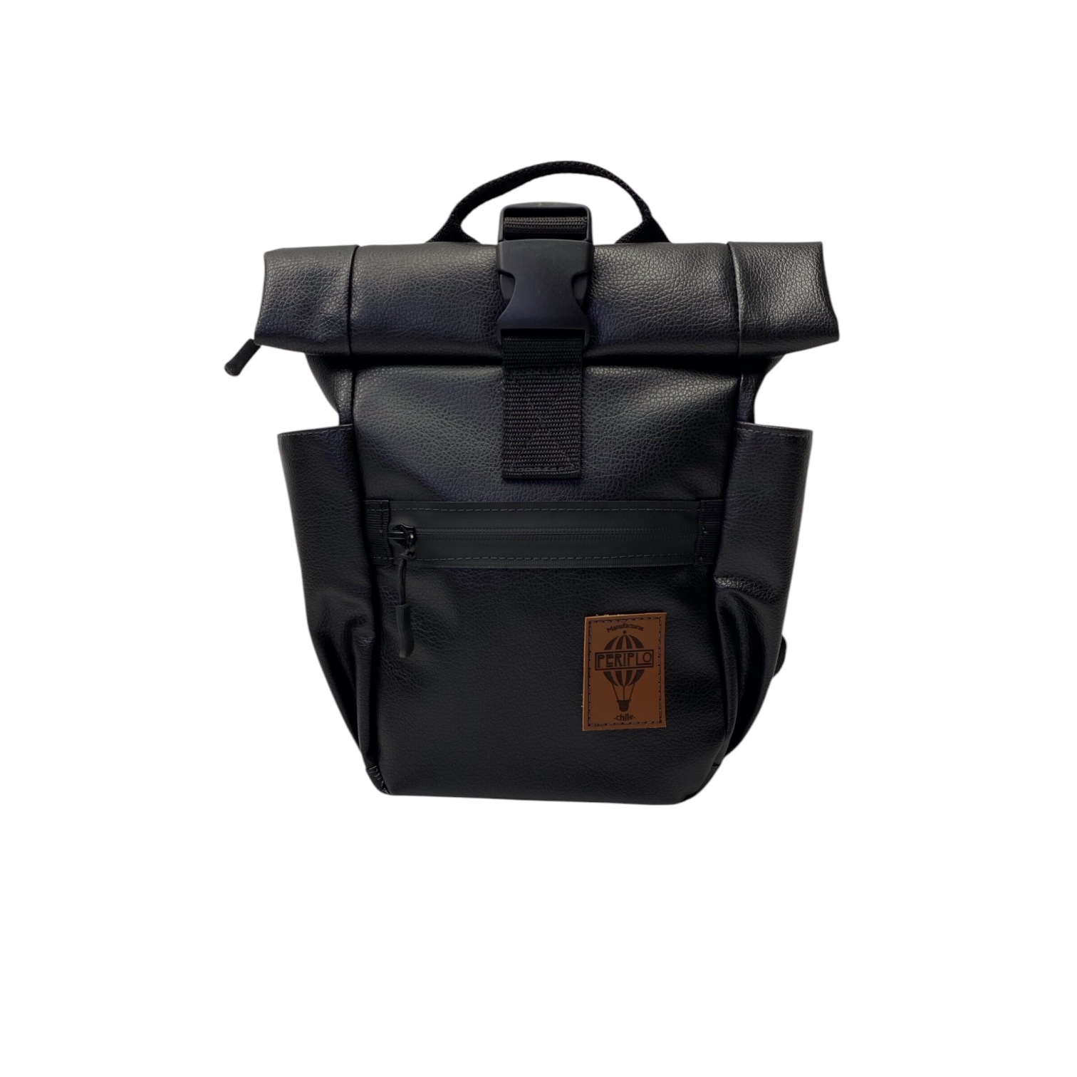 Mochila Extra Pequeña de ecocuero impermeable y antimanchas. Diseño versátil con capacidad ajustable gracias a su extensión. Cuenta con un bolsillo frontal con cierre impermeable, tirantes ajustables y un interior diseñado para tablets de hasta 10″ pulgadas.
